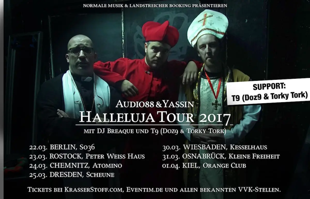 Ready to be blessed: Audio88 & Yassin starten bald in den zweiten Teil ihrer »Halleluja«-Tour. Vielerorts ausverkauft oder hochverlegt, erwarten die Jünger des Kollektivs sehnsüchtig die Vergebung ihrer Sünden. Als Geschenk Gottes für alle armen Seelen, die 2016 keinen Fahrschein in den Himmel mehr ergattern konnten, gibt es jetzt die Zusatztermine für 2017. Tickets sind ab sofort unter krasserstoff.com, eventim.de und allen bekannten VVK-Stellen erhältlich.
