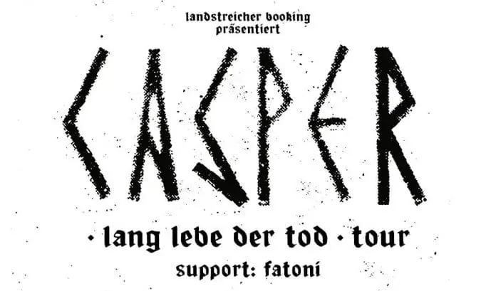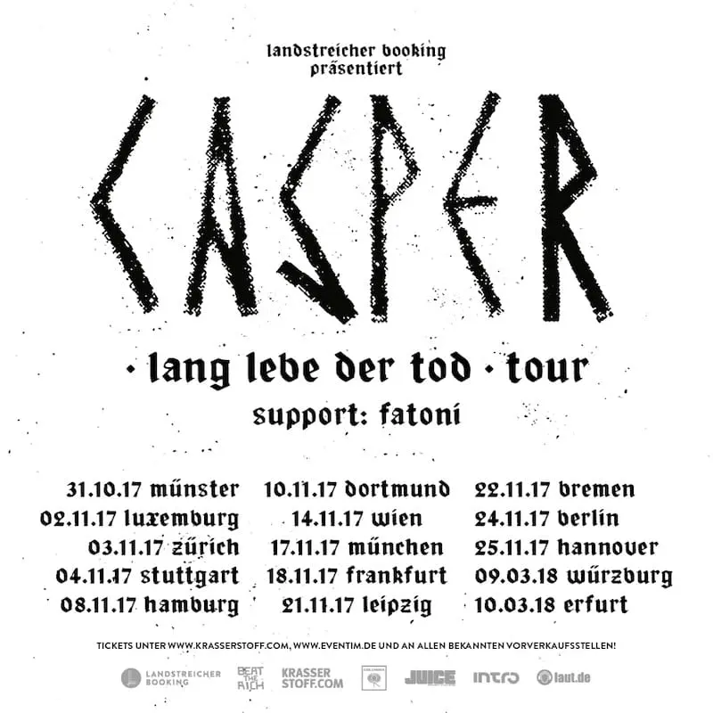 Holt die Mittelfinger raus, Casper lässt wieder die Hallen brennen: Ab Ende Oktober geht’s auf »Lang lebe der Tod«-Tour. Die Support-Act-Koje im Nightliner darf Kollege Fatoni besetzen – oder wie Ben auf Facebook erklärt: »Wir haben näääämlich weder kosten noch mühen gescheut…..und mit kosten und mühen mein ich email und sms, den Fatoni zu fragen ob er bock hat mit uns auf tour zu gehen. und er hatte bock! GEIL!« [sic] 15 Städte werden im Herbst in Schutt und Ascheregen gelegt – nach dem Albumrelease am 1. September bleiben also circa zwei Monate, um sich die Lyrics fehlerfrei einzuprügeln oder den Spickzettel mit Tinte und Nadel unter die eigene Haut zu jagen. Tickets gibt’s hier.