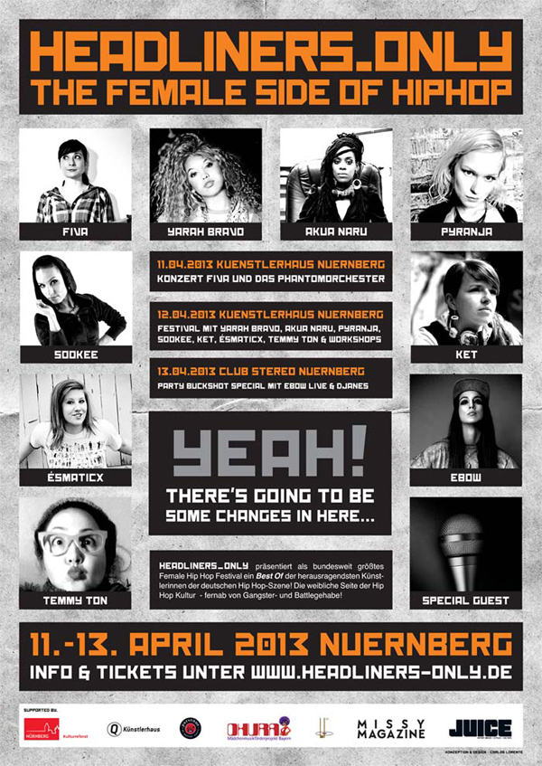Das Headliners_Only Festival präsentiert die »female side of HipHop«. Am zweiten Wochenende im April 2013 hat man einige der bekanntesten weiblichen Rap-Stars der Szene nach Nürnberg geladen, um dort ein wenig Bambule zu machen. Selbst präsentieren sich die Organisatorinnen und Organisatoren als »bundesweit größtes Female Hip Hop Festival der jüngeren Vergangenheit« mit einem »Best Of der herausragendsten Künstlerinnen der deutschen Hip Hop-Szene«. Tatsächlich wird nicht nur geklettert, sondern auch geklotzt. Das dreitätige Festival eröffnet Fiva mit ihrem Phantom Orchester. Am Freitag teilen sich Akua Naru mit Band, ésmaticx, Ket, TemmyTon, Pyranja, Sookee, Yarah Bravo und Dena die Bühne. Am Samstag wird zu DJanes wie Ebow im Club Stereo getanzt. Dazu gibt es Rap- und DJ-Workshops, damit sich die Besucher selbst an der Materie versuchen können. Sollte man sich nicht entgehen lassen.