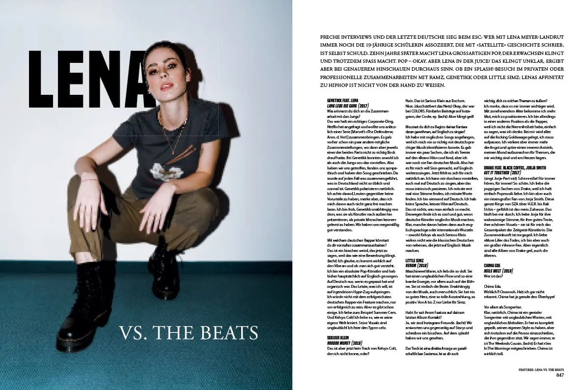 Freche Interviews und der letzte deutsche Sieg beim ESC: Wer mit Lena Meyer-Landrut immer noch die 19-jährige Schülerin assoziiert, die mit »Satellite« Geschichte schrieb, ist selbst schuld. Zehn Jahre später macht Lena großartigen Pop, der erwachsen klingt und trotzdem Spaß macht. Pop – okay. Aber Lena in der JUICE? Das klingt unklar, ergibt aber bei genauerem Hinschauen durchaus Sinn. Ob ein splash!-Besuch im Privaten oder professionelle Zusammenarbeiten mit Ramz, Genetikk oder Little Simz: Lenas Affinität zu HipHop ist nicht von der Hand zu weisen.