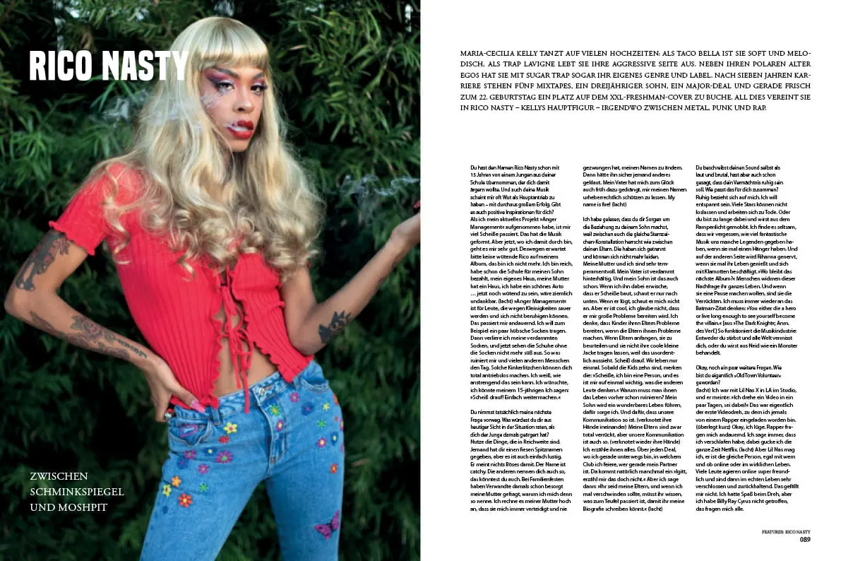 Maria-Cecilia Kelly tanzt auf vielen Hochzeiten: Als Taco Bella ist sie soft und melodisch, als Trap Lavigne lebt sie ihre aggressive Seite aus. Neben ihren polaren Alter Egos hat sie mit Sugar Trap sogar ihr eigenes Genre und Label. Nach sieben Jahren Karriere stehen fünf Mixtapes, ein dreijähriger Sohn, ein Major-Deal und gerade frisch zum 22. Geburtstag ein Platz auf dem XXL-Freshman-Cover zu Buche. All dies vereint sie in Rico Nasty – Kellys Hauptfigur – irgendwo zwischen Metal, Punk und Rap.
