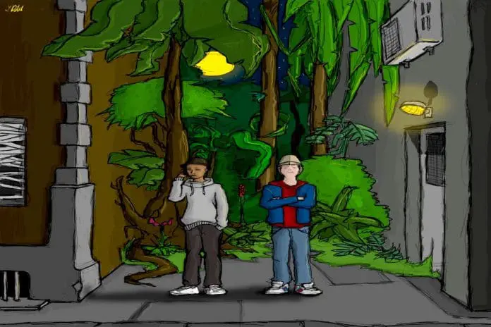 Naru und Kuchenmann haben den (Frankonia) Phonk auf Tasche. Die Pott-Franken-Connection kämpft sich beladen mit abstrakter Melancholie in Beatform durch den »Dschungel«. 2.35 Uhr und das Mondlicht reflektiert an der Windschutzscheibe, während die beiden die Smilingstreet herabfahren und zu denken beginnen. Naru erinnert dabei ein wenig an Knowsum von Luk & Fil ohne sich anzubiedern und kommt ähnlich philosophisch daher, bis die Denkerei durch Schwanz-Auf-Den-Tisch-Talk aufgebrochen wird. »Musik ist immer noch Kunst und kein Sport«, sagt Kuchenmann und fasst zusammen, was auf »Dschungel« Priorität ist. Es geht um Selbstreflexion und den Weg durch das Gedanken-Dickicht, nicht um fünfsilbige Reime und Flow-Massaker. Den Einstieg in die verzweigten Urwald-Pfade findet man hier als kostenlosen Download.