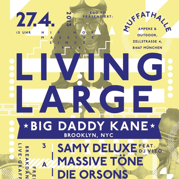 1994 war es zum ersten mal so weit – Anfang des Jahrtausends wurde es dann allerdings still um das Living Large Festival. Nach zehnjähriger Pause kehrt die größte Hip-Hop-Jam in Bayern zurück. Und wie. Neben hiesigen Größen wie Samy Deluxe, den Orsons, Retrogott & Hulk Hodn und den Münchner Altherren von Main Concept haben die Veranstalter mit Big Daddy Kane eine echte US-Legende als Headliner an Land gezogen. Zudem lassen sich die Massiven Töne nicht lumpen und holen die bereits leicht angestaubten Mics aus dem Schrank. Abgerundet wird das Line-Up durch neue Talente wie Edgar Wasser und 3Plusss & Sorgenkind. Während sich das musikalische Programm über drei Bühnen erstreckt, ist außerdem mit B-Boy- und Freestyle-Battles sowie Live-Graffiti bereits am Nachmittag Action geboten. Ganz in der Tradition der Veranstaltung wird außerdem auch dieses Jahr der eine oder andere Überraschungsgast seinen Weg auf die Living Large-Bühnen finden.