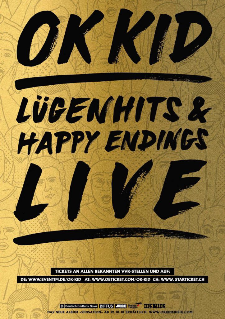 OK Kid hätten es sich bequem machen können. Ihre Formel aus leichtfüßigem Indie-Rock und beat-lastiger HipHop-Kante, den emotionalen Befindlichkeits-Lyrics und diesen butterweichen Melancholie-Melodien hätten Teenager-Herzen höher schlagen und vermutlich die Bandkasse klingeln lassen. Doch stattdessen haben sich Jonas Schubert, Raffael Kühle und Moritz Rech entschieden – entschieden sich und ihre Musik in Frage zu stellen. Aber auch die Selbstinszenierung in den Sozialen Medien, Konsumwahn, ja die Gier nach Sensationen. Und die politische Situation in diesem Land, die beispielsweise vergangenes Wochenende in Chemnitz eine beängstigende Fratze zeigte. All dies soll sich auf dem am 19.Oktober erscheinendem Album-Drittling »Sensation« niederschlagen.