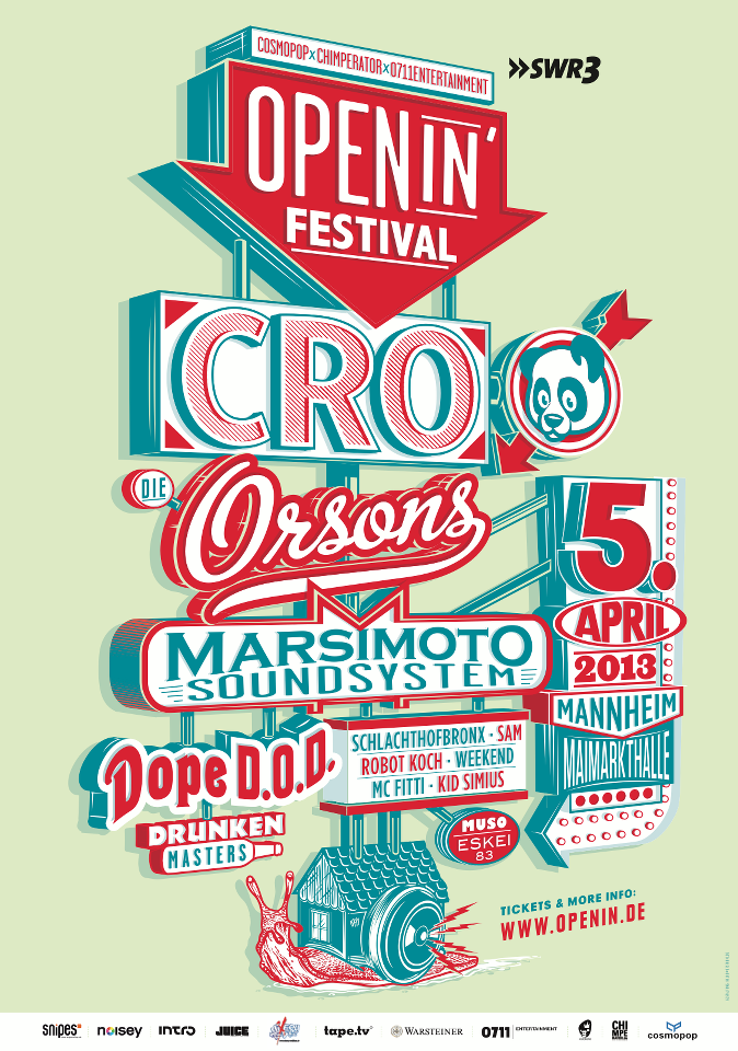Die Chimperator-Affen drehen durch. Klar, spätestens 2012 sind sie komplett durch die Decke gegangen. Natürlich wegen Cro. Aber eben auch wegen der Orsons, die eines der besten Alben des Jahres veröffentlichten. Und wegen ihrer großartigen Live-Arbeit. Nach der mehr als erfolgreichen Cro-Tour, wo zu jedem Termin gut und gerne um die 10.000 Menschen erschienen, geht es locker easy weiter. Das Openin Festival steht an. Anfang April werden in Mannheim die Aushängeschilder von Chimperator – Cro, Die Orsons, Sam und Muso – auftreten. Dazu gesellen sich Kool Savas, Weekend, die Drunken Masters, Robot Koch, MC Fitti, Dope D.O.D., Marsimoto Soundsystem und Dexter sowie Suff Daddy. Klingt nach einem sehr guten Start der Festival-Saison. Tickets und weitere Informationen gibt es hier.