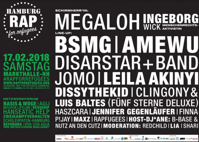 Am 17. Februar bringt »Rap for Refugees« ein hochkarätiges Line-Up auf die Bühne: Amewu, Disarstar, Leila Akinyi, Dissythekid uvm.. Megaloh wird hierbei nicht nur mit BSMG auf der Bühne stehen, sondern auch gemeinsam mit der Menschrechtsaktivistin Ingeborg Wick Schirmherr der Veranstaltung sein. Die Erlöse des Kompaktfestivals kommen dem gemeinnützigen Verein »Rap for Refugees« zu gute, der Workshops für geflüchtete Kinder und Jugendliche sowie Schulprojekte und Veranstaltungen supportet. JUICE verlost* unter allen Einsendungen mit dem Betreff »Rap for Refugees« an verlosungen [at] juice.de 3×2 Tickets für das Festival.