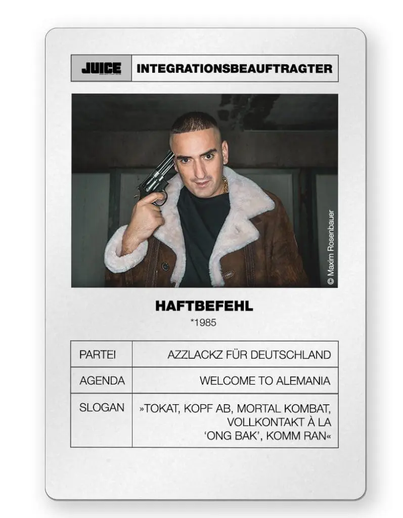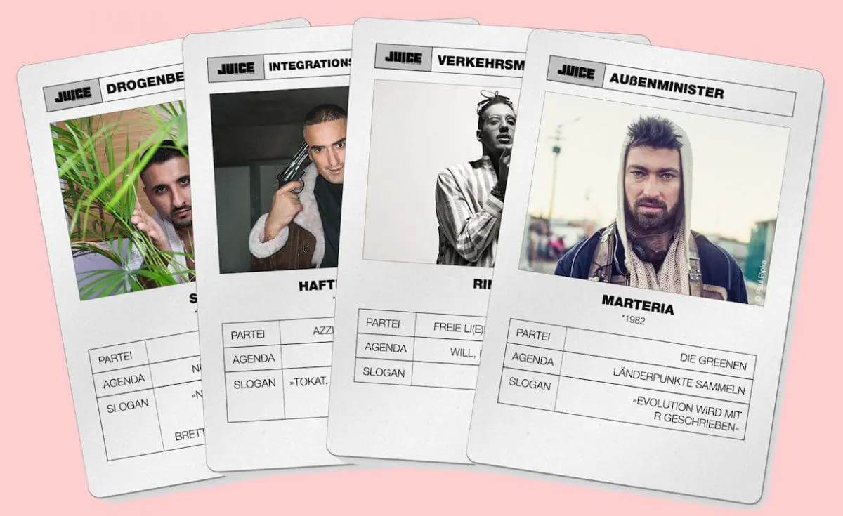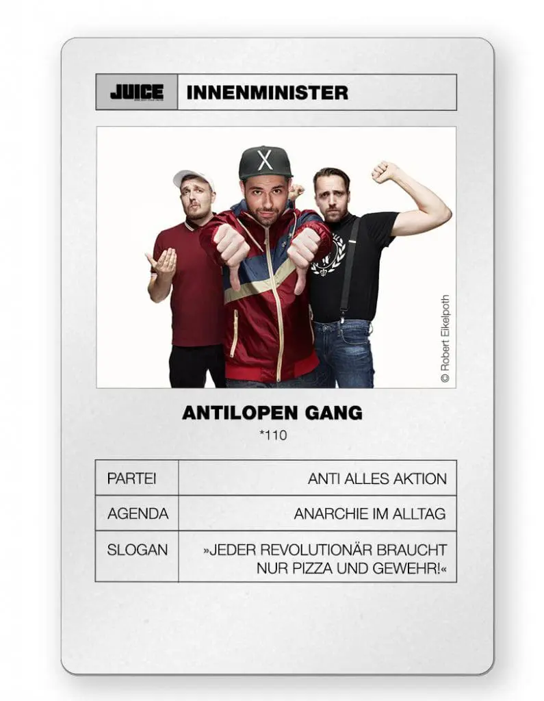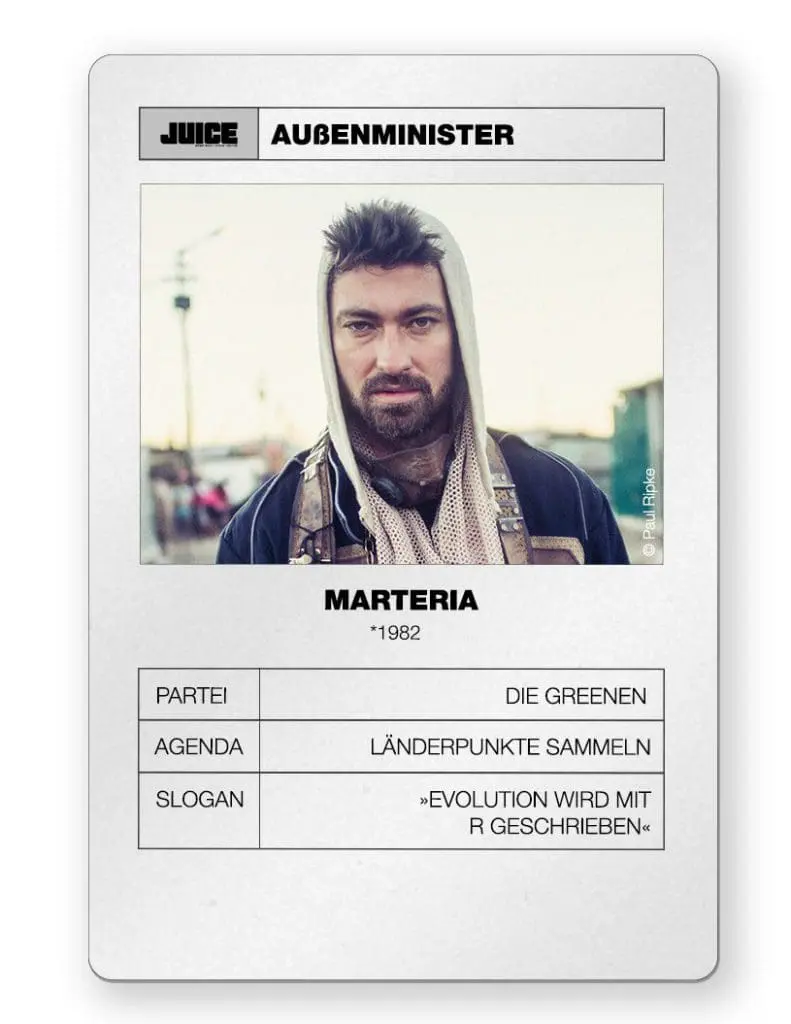 Doch wir alle wissen insgeheim: Rap regiert. Unser Leben, euer Leben, ja eigentlich die Welt. Wir haben uns anlässlich dieses unumstößlichen Faktes ein kleines HipHop-Kabinett in Quartett-Form ausgedacht – eine Kartenspiel-Regierung aus Rappern. Wer ist schon Frank Walter-Steinmeyer? Unser Titelheld aus Ausgabe #180 und das »gottverwandte Alien« Marteria könnte den Außenminister-Posten deutlich kompetenter bekleiden, nicht? Goldraub-König Xatar ist in Kapitalfragen sowieso nachweislich erfahrener als Herr Schäuble und ein bisschen Swagger in den Reichstag zu tragen, ist ohnehin überfällig – hier wäre der beste Producer-On-The-Mic Dexter die Vorreiterfigur unserer Wahl für eine Regierung, die garantiert wortgewandt, jederzeit überzeugend im Auftritt und vor allem eines ist: volksnah. Rock, nein, rap the vote!