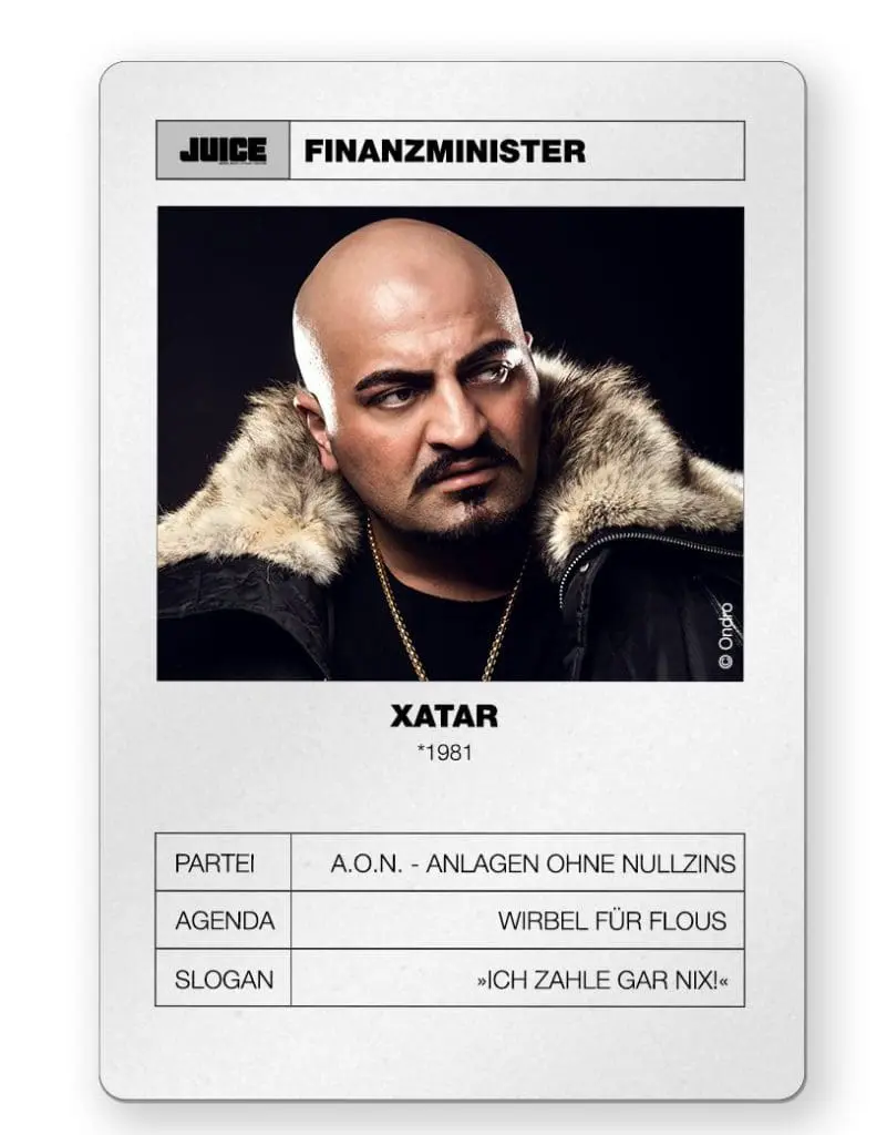 Xatar ist unser Mann fürs Finanzielle – Haushaltsüberschuss iz dank dem Mantelminister sowas von da. Und auch eine erneute Ernennung von Bobinn zur Bundeshauptstadt scheint plötzlich wieder möglich.