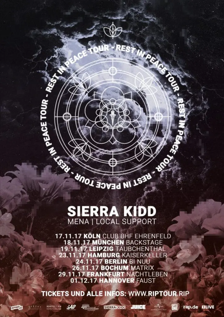 Auf dem bisherigen Höhepunkt seiner Karriere feiert Sierra Kidd eben diesen mit seinen Fans. Der Wahl-Hamburger und Schlafverweigerer geht anläßlich seines letzten Releases auf »Rest in Peace« Tour. Im Gepäck hat der polarisierende Youngster seine Gang, das Teamfucksleep, eine suizidiale Aura und jede Menge Hits. Das Vorbeikommen schadet nicht, denn wie wir alle wissen ist das gesichtstätowierte Kidd zwar »strapped«, aber nicht »violent«. Man kann sich also ganz unbesorgt hier ein Ticket holen und in folgenden Städten vorbeischauen.