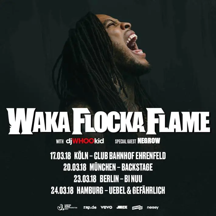 Was lange währt? Wollen wir’s hoffen – denn nach Jahren der leeren Versprechen und konstanten Verschiebungen ist es nun so weit: Waka Flocka Flame hat tatsächlich »Flockaveli II« fürs kommende Frühjahr angekündigt. Ob Flocka dann an die Erfolge seines legendären Debüts anknüpfen und mit der jungen Generation gehypter Rapper aus Atlanta (Lil Yachty, Rich The Kid, 21 Savage und Konsorten) mithalten kann, bleibt abzuwarten. Was jedoch als sicher gelten dürfte: die Live-Shows des ehemaligen Gucci Mane-Zöglings werden wohl auch 2018 in Sachen Litness schwer zu überbieten sein. Nicht zuletzt dank eines legendären Auftritts beim Splash! 2013 hat Flocka seinen Status als Live-Monster auch in Europa zementiert. Dementsprechend kündigte das Brick-Squad-Oberhaupt nun pünktlich zur Rückkehr auf Albumlänge eine Headliner-Tour durch vier deutsche Städte an. Als Specialguest ist der Hamburger Negrow dabei. Steilshoop represent! Der Vorverkauf für die Shows im März läuft seit heute.