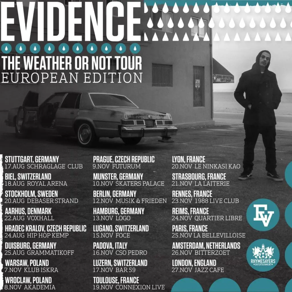 »Du kannst nicht einfach zwei Leute in einen Raum stellen, und danach ist der Shit hot. Das funktioniert nicht, egal wie groß ihr Name ist«, sagte Evidence im JUICE-Interview 2004 über Zusammenarbeiten mit anderen Musikern. Als Indie-Koryphäe hat sich der Kalifornier die Booth in den nun mehr fast 20 Jahren seiner Rap-Karriere bereits mit Kanye West, Alchemist oder DJ Premier geteilt. Der letztjährige Solo-Drittling »Weather Or Not« zeigte einen gereiften Rap-Künstler der Mittelschicht in seinem natürlichen Habitat aus Sample-Overtüren und Realtalk-Dichtkunst. Evidence ist ein MC. Und als solcher eilt ihm natürlich auch der Ruf eines respektablen Live-Performers vor raus. Bereits im September 2017 gastierte EV auf deutschen Bühnen, um diesem Image auch Taten folgen zu lassen. Nun hat Mr. Slow Flow erneut Termine in Germany angekündigt – denn Rap ist kein Beruf, sondern eine Berufung.